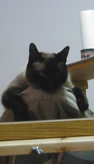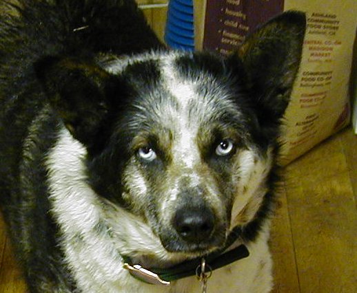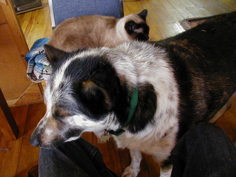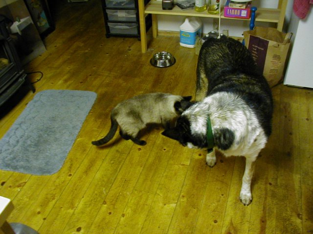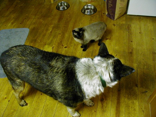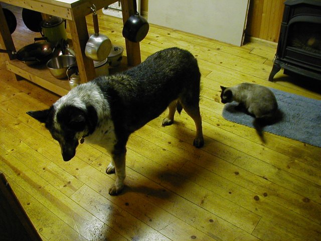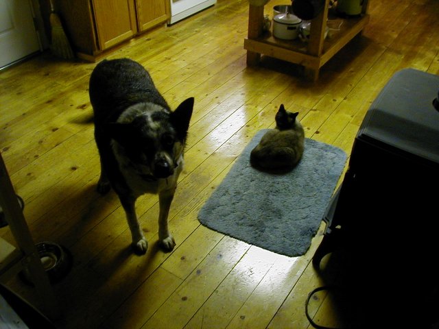 It was a dark morning, overcast, and I didn't have the kitchen lights on. I had put some food in Sitka's dish and opened the back door so she could come in. It was dark in the kitchen. Kitty and I were in the back room. As I started toward the kitchen I saw Bugeyes standing in the kitchen just unside the doorway. She was looking hesitant and sort cautious, like she thought she shouldn't be there. I don't often let her in because she and Sitka together are so rambunctious. Anyway, the dim lighting was so strange that it made a fascinating sight. I stood still and she never noticed me. Then Kitty moved forward and made a rrrraarrrr sound in her throat. She is not real fond of Bugeyes. Bugeyes turned and looked at the cat but didn't move. Then she cautiously began eating Sitka's food. It was a strange event.