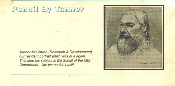 Here is a clipping from the Rosemount Analytical company newpaper. The subject was my friend Bill who was in charge of the main-frame there and who died of a heart attack about a year after the drawing was done.