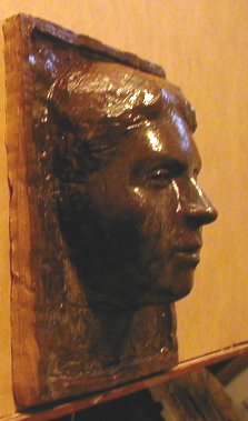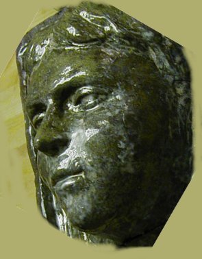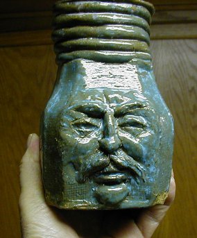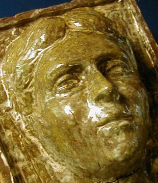 I've been experimenting with re-glazing. It is even more unpredictable than the first glaze. I began to appreciate how much the result depends on the color of the clay. Green glazes look green on a white clay body but brown on a red clay body. I tried lightening the face so that the features were easier to see. Now I am going to make some kind of mold of it and press clay into the mold for another one. The original has several cracks in it. I hope to be able to prevent that in the future. It depends on how the thing is built, how it is dried and how quickly it is fired. Here are a couple shots of the face.