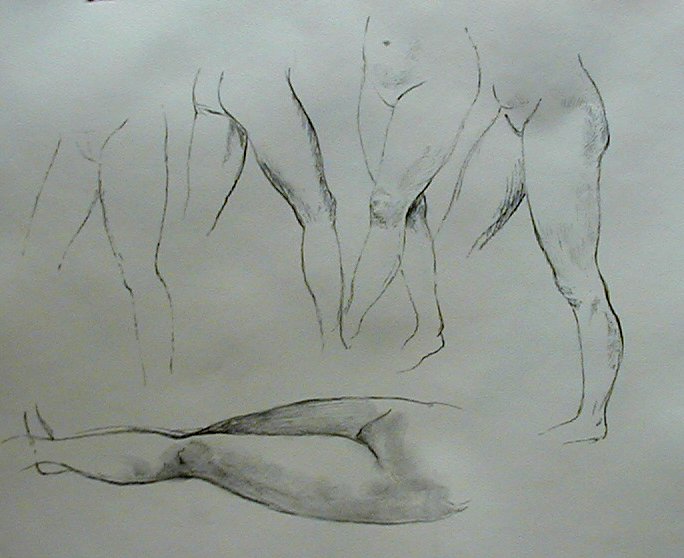 Driving home from the figure drawing class I was enjoying seeing. I noticed that I was moving my eyes a lot also. This eye movement thing comes up over and over. It seems to be some fundamental thing with me. At the times that I experience free eye movement I feel sensations in my neck and throat. And often there is a lot of feeling in my hands at the time also. At the class today I said, "It's all in the hands, you draw with the hands." People said, "Well of course. So what?" I said, "I'm mean you pay attention to your hands as you draw." Of course everyone 'knows' that you draw with your hands, but here is a very big difference between 'knowing' and experiencing. Knowing is a static, fixed sort of thing. Sensing is not.