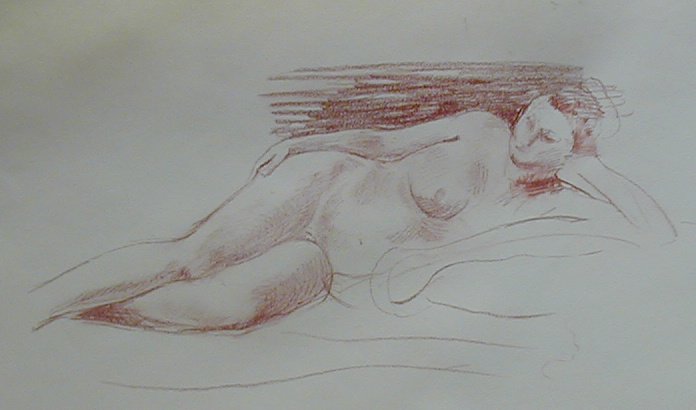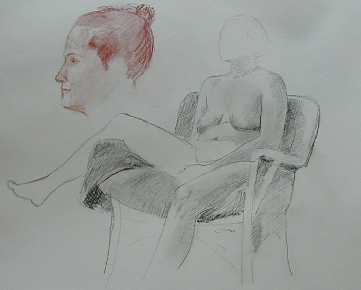 I was a little late getting to the life drawing class because they always start with short poses which I don't care for. As I approached the building I noticed some of the cars were leaving. I walked in and everyone was standing around talking. The model never showed up. I said, "Well we can model ourselves." Greg, the instructor, said, "Sure we can do that." I set my pad on a table and went to the model's stand and sat down. I sat there a while and no one seemed to notice. I got up and picked up my pad and coffee cup to leave. Greg said, "Are you leaving?" I said, "Yes. I was modeling and no one was drawing." He asked me to do it again and added that he didn't feel like drawing. So I sat down again. Greg and another guy kept talking rather than drawing which was annoying. I sat still for a half hour. The longest they ever have a model sit is 20 minutes. It was easy. I was just meditating. One woman said, "I hope you aren't setting a precedent for the rest of us." Everyone took a break around the coffee pot. During the break I said, "something I noticed while modeling was that no one was looking at me most the time. Everyone spent most their time looking at their drawing and just took quick glances at me now and then." Greg did a few 10 minute poses. No one else offered so we all left early."