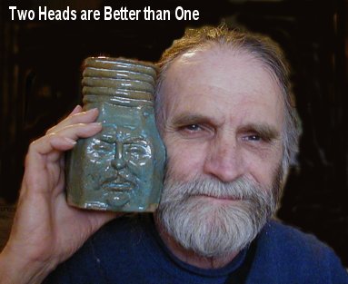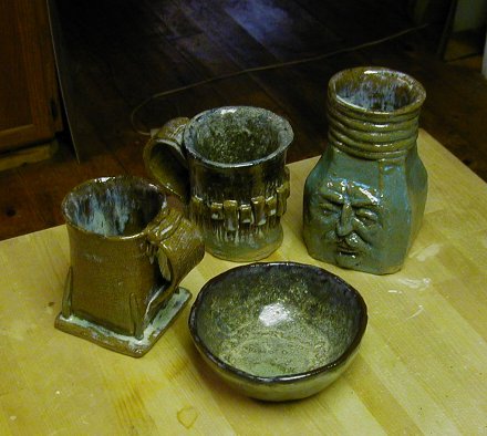 Friday, February 25, 2005. Opened the kiln this morning. Had a couple bowls in there. The outsides looked pretty good. There are several coffee cups and a head (or face). One cup has a little face on it.