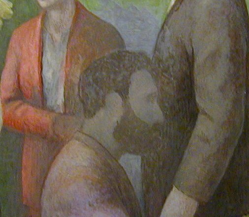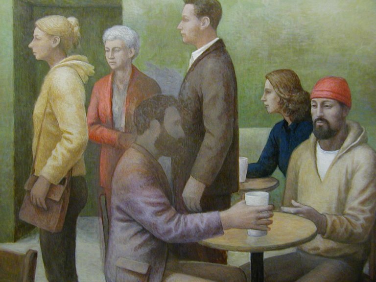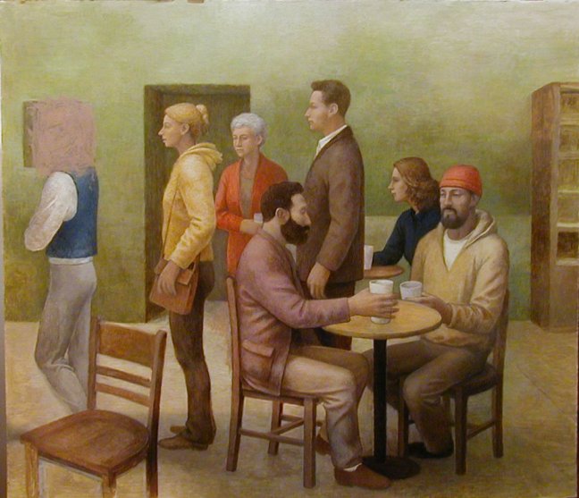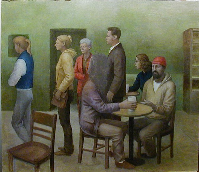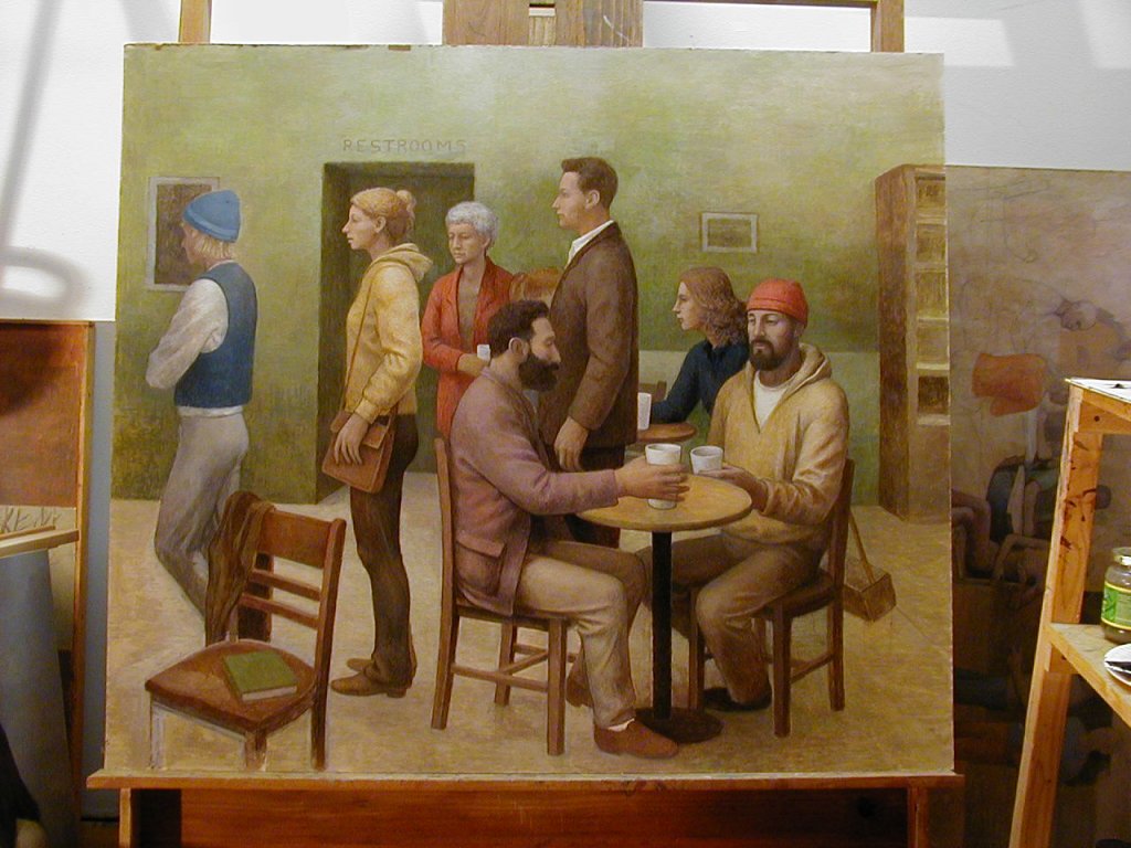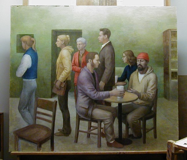 Here's the latest on the coffeehouse picture. I've been working on other things, but this is the only one I have been documenting. The subject has changed very little. Some of the elements have been getting clearer and more solid looking so that there is more of a feeling of solid objects in space. There is still a lot to do.