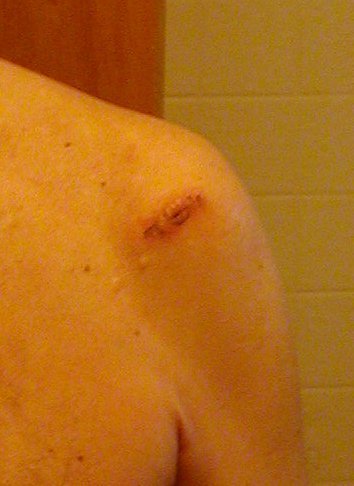 Monday, May 2, 2005. Been sleeping an awful lot lately. Made an appointment with a dermatologist regarding a little red sore spot on my shoulder. She thought it might be cancerous, basal something, and took a biopsy. Then she found another like that on my back and then a mole on my arm that she thought might be melanoma. So she took three biopsys. Boy, that put a damper on my day.