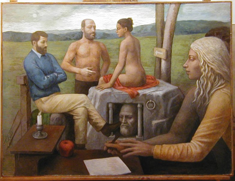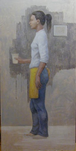 Monday, April 25, 2005. I have been working on paintings a bit the last few days. It is a slow process. I use a very small brush with thin paint. I am able to maintain the feeling of reaching into the distance, that is into an apparent space behind the surface of the painting, and carefully and slowly deposit paint strokes onto the apparent surface of imagined objects in that distant space. It feels as though I am wiping the paint off the brush onto the object's surface far behind the surface of the painting. As the objects develop it becomes easier to maintain that feeling and as the object begins to look more solid so I feel the brush in my hand more and the object takes on a solid tactile appearance.