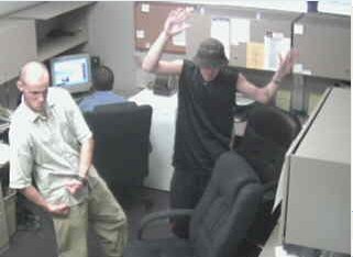 yeah, ben's still working at the same place here with me. in fact, he works right behind me. here's a photo of our office captured by the security camera about a month ago. i'm on the left, another guy is on the right, and you can see the back of ben's head between us. the chair in the foreground is my chair (i work kinda underneath the camera). the other guy works in the corner there where his chair is. as you can see, ben doesn't take his work seriously like we do.